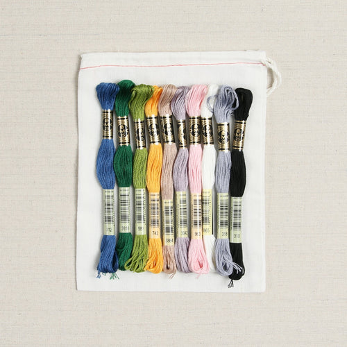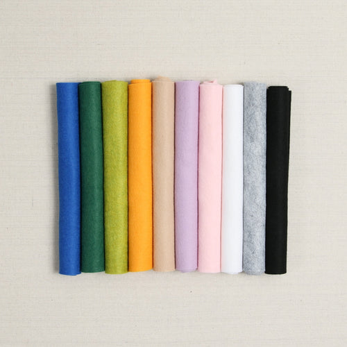 Designed by author and artist Sabina Gibson for her book "Felt Softie Parade," this palette includes ten colors in Cobalt*, Emerald, Citron, Tangelo*, Seaside, Allium*, Peony, Bellwether White*, Smoke and Bellwether Black*. Coordinating DMC floss is also available. *Indicates Bellwether 100% felt