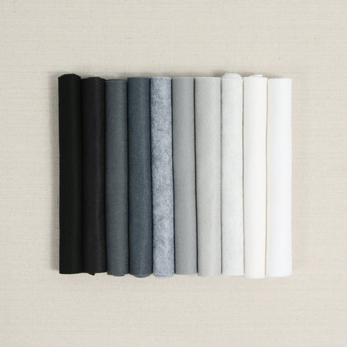 Our monochromic series includes tones and tints of the Benzie rainbow -each palette incorporates shades from both our wool blend and pure wool felt collections. The Graphite Medley includes 10 sheets in the colors *Bellwether Black, Black, *Slate, Graphite, Smoke, *Ash, Silver, Parchment, *Bellwether White and White. Coordinating DMC floss is also available. *Indicates Bellwether 100% felt.