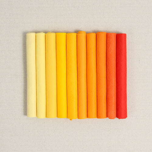 Our monochromic series includes tones and tints of the Benzie rainbow -each palette incorporates shades from both our wool blend and pure wool felt collections. The Tangelo Medley includes 10 sheets in the colors Butter, Lemonade, Dandelion, *Mikado, Golden, *Tangelo, Tangerine, *Clementine, Marigold, and Carmine. Coordinating DMC floss is also available. *Indicates Bellwether 100% felt.