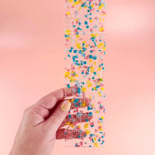 2.5 by 10 inch quilting ruler. Markings are every 1/8 inch, with a diagonal line at 45 degrees on either end for easy half square triangle trimming. This is a great size for trimming quilt binding! Laser cut and engraved from 1/8 inch acrylic. The markings are engraved so they'll never rub off. Non-slip dots provided with every ruler.