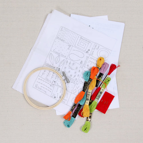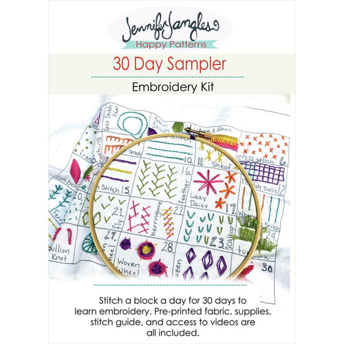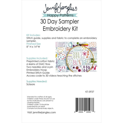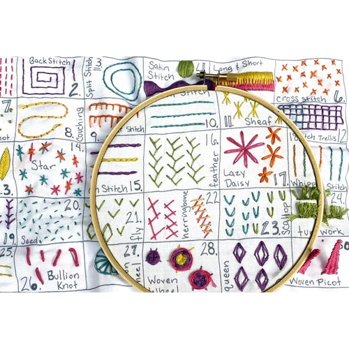 The 30 Day Sampler Embroidery Kit will take one through everything they need to learn embroidery. Starting with the basics on day one, learn a new stitch each day building on 4th previous days knowledge. Complete illustrated stitch guide is included in the kit. Online videos are also included with purchase. Each kits includes an access code to access the 30 plus videos. Some stitches include the back stitch, queen stitch, wagon wheels, and woven picot. When the sampler is finished you will have a completed sampler with 30 stitches. Kit includes: pre printed fabric, stitch guide, needles and pin, six full skeins of floss, embroidery hoop, stitch guide, and access to videos.