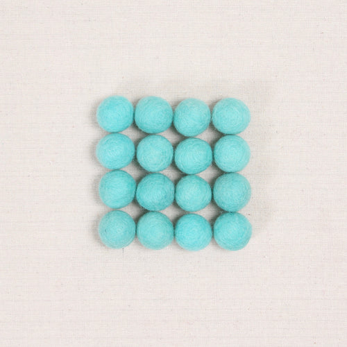 Aqua felt balls. Carefully hand felted by our partners in Nepal, expect some variance in size and color. Extra Small, Small, and Medium sizes include 50 poms per bundle. Large poms include 20 poms per bundle.
