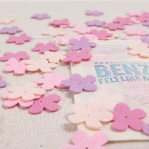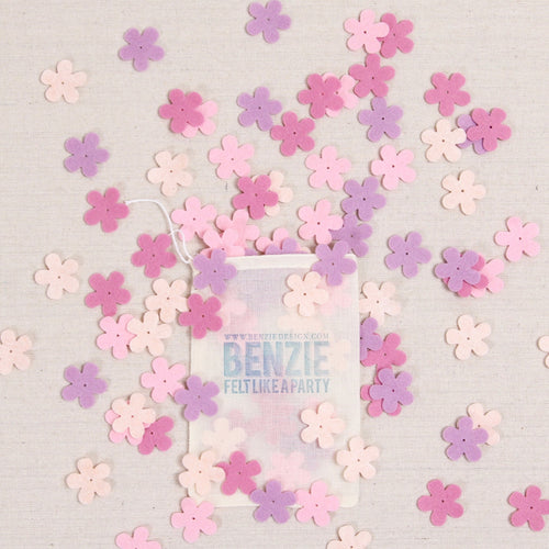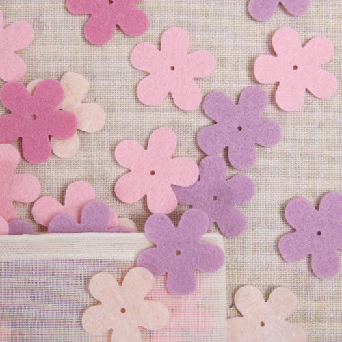 Pretty blossoms, freshly cut. Dainty little flowers are about 1" wide with a center hole, 90 total. The standard palette includes Lilac, Foxglove, Pink and Oats; or select a custom palette of up to four colors!