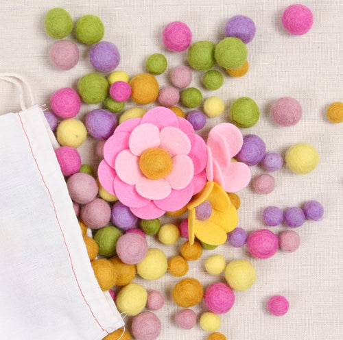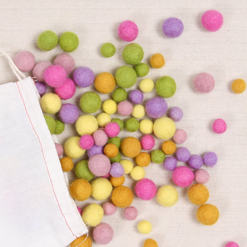 A mix of our extra small poms and small poms -we especially love them for forming flowers as they make lovely little blooms! Includes colors Orchid, Thistle, Mustard, Foxglove, Lemonade, and Fern. Total 50 poms.