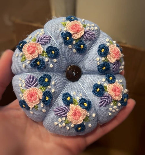 This beautiful pincushion features beautiful floral embroidery and would make a unique and lovely gift for you or anyone who enjoys sewing or handcrafting. A pretty addition to the sewing table!