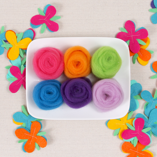 Happy and bright! Roving in a cheerful palette of Blossom, Tangerine, Chartreuse, Nightingale, Purple and Thistle. Select six 1/2 ounce or 1 ounce balls of sliver roving for use in needle felting, wet felting, or weaving.