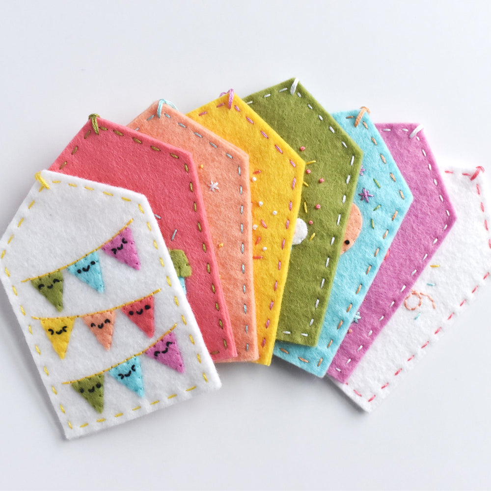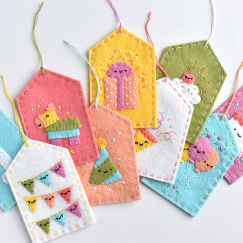 Celebrate all things happy with this super cute pattern for making felt ornaments, tags, and even a banner! The party-themed designs feature sweet little faces that are sure to bring joy to your next celebration.