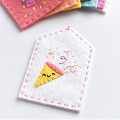 The 20-page project PDF includes full instructions with photos to make 18 felt appliqué designs. The included designs are: a piñata, party popper, balloons, gift, cupcake, party hat, birthday cake, pennants, and birthday candles numbered 0-9.