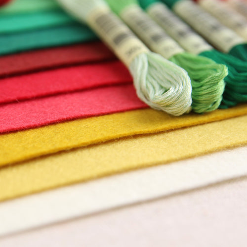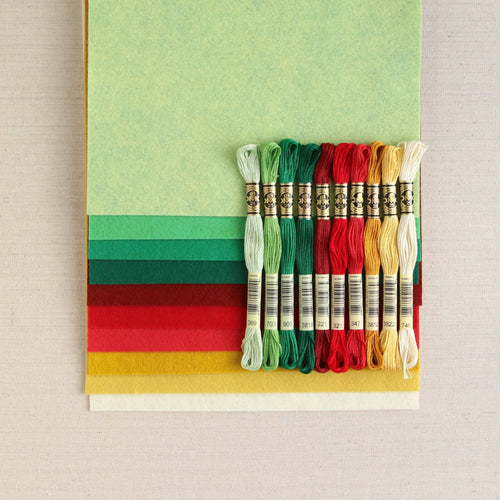 Wool blend felt sheets in cheery classic Christmas colors: Pistachio, Clover, Kelly, Emerald, Crimson, Red, Strawberry, Mustard, Ochre and Ecru, ten sheets total. Select 9x12" or 12x18" sheets from our drop down menu. Coordinating DMC embroidery floss is also available.