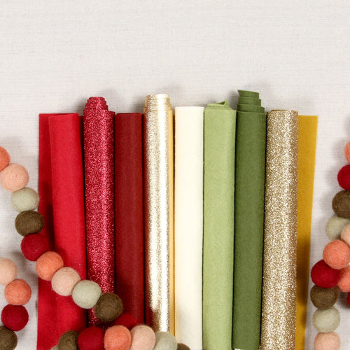 Deep reds and festive greens! Medley palettes include our favorite wool blend, pure wool and finished felts all in one pretty bundle! Includes eight 9x12" sheets. Limited Edition.