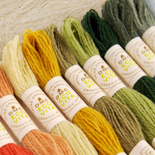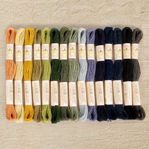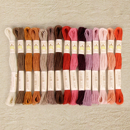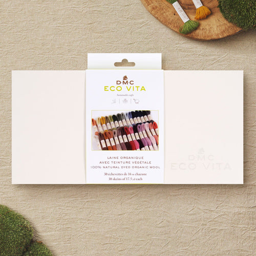 This limited edition high-quality card box includes 30 full-sized, 16m skeins of Eco Vita Organic Naturally Dyed Organic Wool Thread. There are two free patterns included to inspire you to start stitching with this extraordinary, sustainable thread.