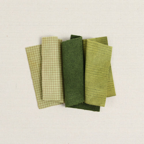 Hand dyed wool in herringbone, houndstooth and dots. Felted wool starts as 100% woven wool that's been washed and felted for softness and body. Includes 3 green shades that are approximately 6x9 inches.