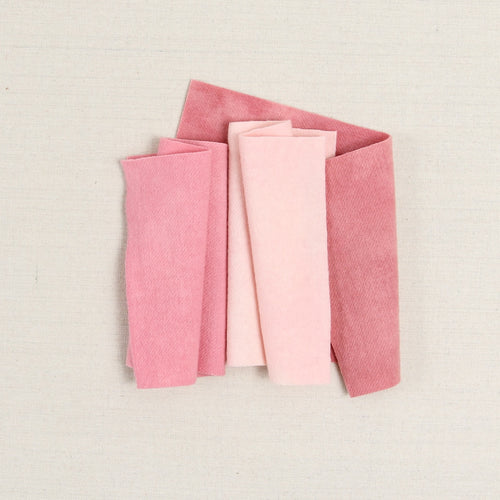 Felted wool is a 100% woven wool that has been washed and felted for softness and body. Hand-dyed textiles often have a mottled or marbled finish that will add natural variance and softness to your craft. This bundle includes three pink shades that are approximately 6x9 inches each.
