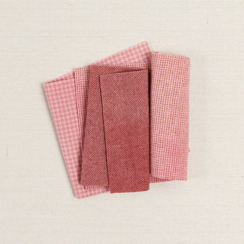 Hand dyed wool in herringbone, houndstooth and dots. Felted wool starts as 100% woven wool that's been washed and felted for softness and body. Includes 3 pink shades that are approximately 6x9 inches.