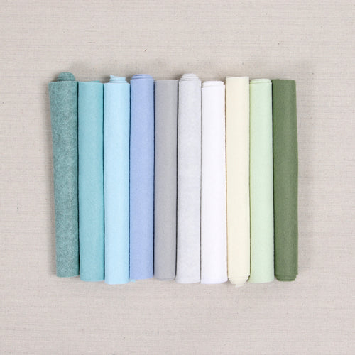 The changing seasons brings a frost and then a flutter of snowflakes. Use this felt for hot cocoa crafting! Includes 10 colors in Rainstorm, Swan, Icicle, Sky, Silver, Parchment, White, Ecru, Mint and Sage. Coordinating DMC floss is also available.