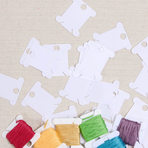 Best way to organize your threads. These plastic bobbins are easy to wind and feature an area to write the DMC color number on the front, and hole for looping on a key ring. This package contains twenty-eight 1-1/2x1-1/2in floss bobbins. Imported.