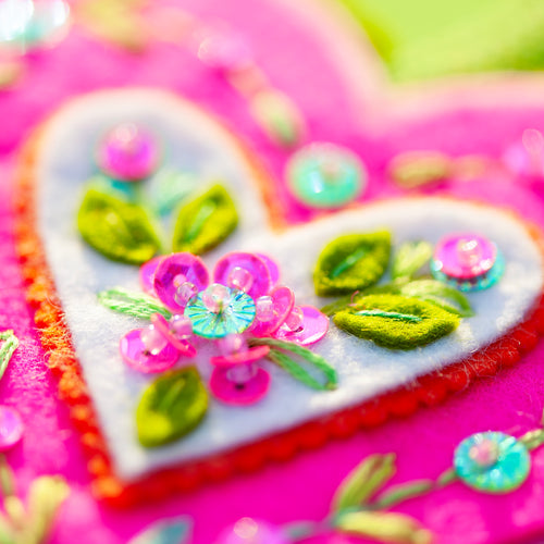 Craft two beautiful wool felt heart ornaments with this all-inclusive supply kit! These elegant ornaments are made from 100% wool felt in rich, vibrant colors. Each ornament measure 4 1/2” x 4 1/2” (not including the hanger.)