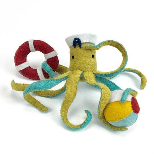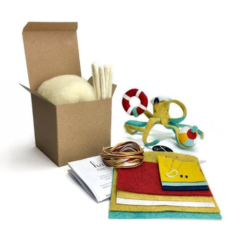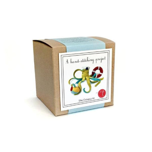 Stitch our Ellie Octopus kit for yourself, make her a friend, or share the gift of stitching with someone special! This kit includes all the materials needed to create Ellie Octopus and her colorful beach gear (beach ball, sailor hat and life ring). Simply cut out the pattern and fabric inside, then stitch your kit together following step-by-step instructions and illustrations. Ellie finishes at approximately 10 inches wide (with legs completely outstretched) and about 7 inches wide as pictured. The height of her head (including her hat) is about 2 inches.