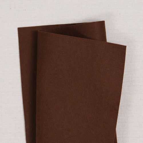 Pure 100% wool felt in a dark Hazelnut brown. Select cut sheets or yardage. A 1 yard cut measures 36"x72". Maximum continuous cut is 1 yard. Anything over 1 yard will be sent in multiple cuts. Coordinating DMC six strand embroidery floss and Sulky appliqué thread is also available.