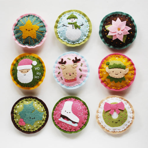 I simply love vintage felt Christmas ornaments and fondly remember adding them to my grandparents’ tree every year. The best ones were handmade by family members and with this pattern set you can join in this fine tradition of crafting felt ornaments for friends and family! Each finished ornament measures about 3-1/2 inches across.
