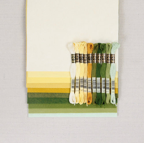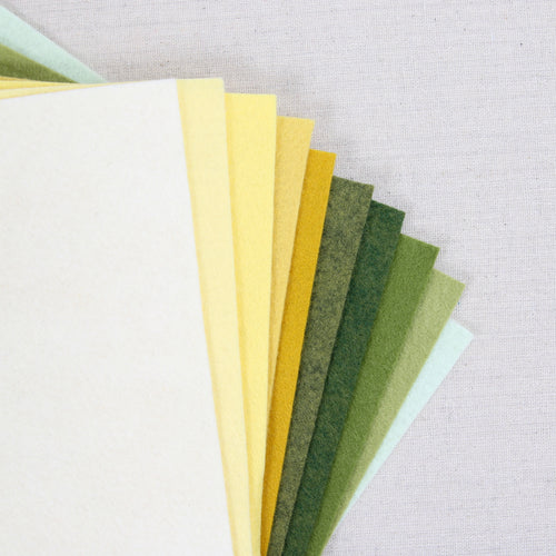 Springy wool felt colors in Lemongrass-with hints of lemon and mint! Colors include Ecru, Butter, Lemonade, Ochre, Mustard, Zucchini, Meadow, Moss, Fern and Mint. Coordinating DMC floss is also available.