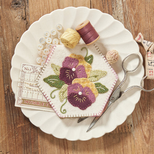 This Needle Keep Kit in a sweet spring pansy design includes a pattern, felted wool, fabric and buttons. You will need floss, fusible webbing and Shape Flex. Benzie recommends using EZ Print Lite for both! Finished size is 4.5" x 5". By Buttermilk Basin