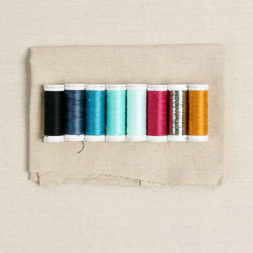 Includes 8 coordinating bobbins of Sulky Embroidery Thread in Seamist 1077, Nordic 1045, Cerulean 1206, Magpie 4022, Butterscotch 1826, Metallic Pastel 8024, Cerise 1191 and Black 1005.
