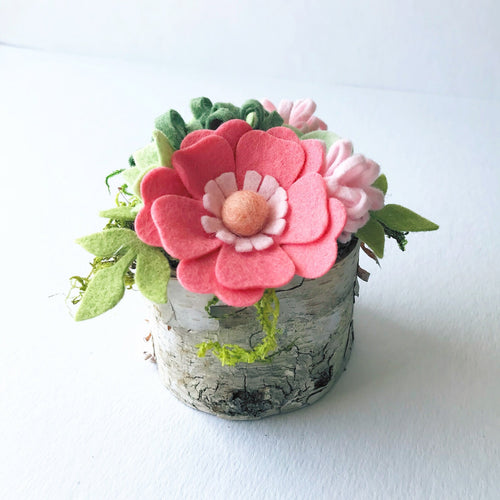 Included are enough pieces of felt to create 1 small poppy, 1 small rolled rose, and 1 small mum along with 2 buds and 4 greenery accents. All you will need is a hot glue gun and sharp scissors for minimal cutting to complete the flowers. This kit is the perfect size to make headbands, add to a larger project, small signs, and mini wreaths.