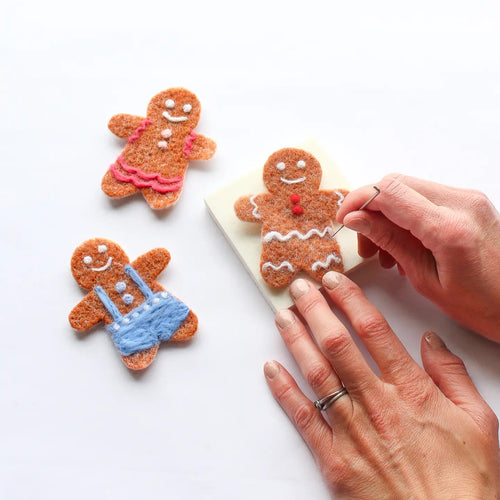 This mini kit is perfect size for a stocking stuffer, or fun and quick holiday crafting with kids. A wonderful project for eye-hand coordination and inspiring creativity! A high quality, approachable Needle Felting Craft Kit that invites beginners & beyond to experience the joy of felting wool. Following simple instructions, crafters add cute faces and outfits to gingerbread people. They will find enjoyment beyond honing the craft itself, as they can string the decorated cookies to make ornaments for decorating, or use as table place settings, or gift toppers.