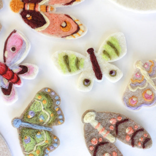 Needle felt your own beautiful set of moths with this simple and rewarding felt craft kit. String your moths together to make a lovely garland, use as individual ornaments, incorporate in your tablescape, or use however they inspire you! A Perfectly unique decoration for garden parties, summer and fall weddings, and birthdays.