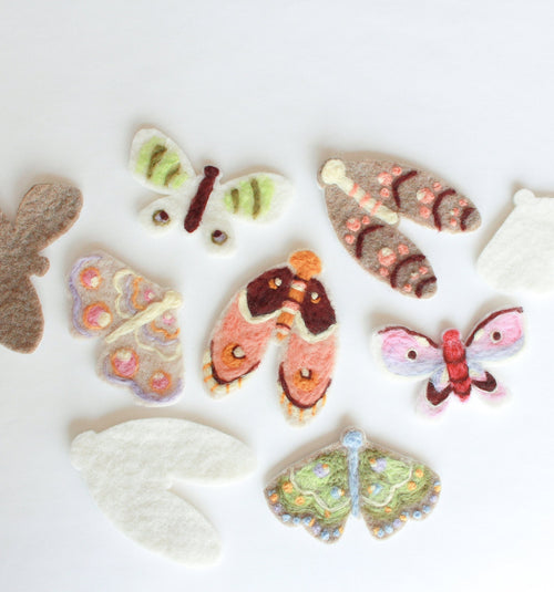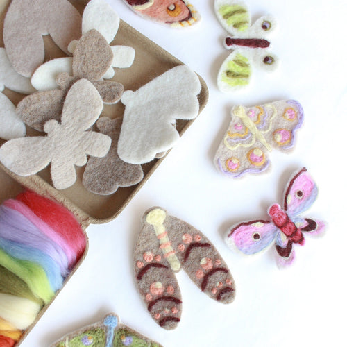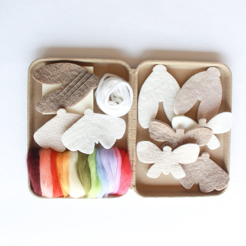 This kit includes 9 wool felt moth shapes in pretty pastel tones as well as wool in a variety of colors to needle felt decorations in the style and combination of your choice!
