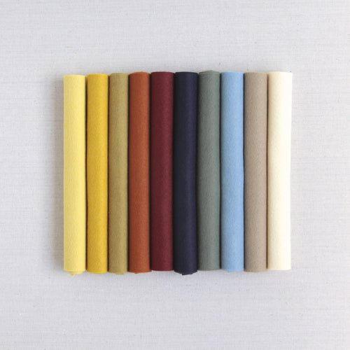 Benzie's wool blend felt in Oxford Blue, a classic navy. Select cut sheets or yardage-multiples of 1/2 yard cuts will yield one uncut sheet. Our bolts are approximately 36" wide. Full bolts are 40% off the retail price of cut sheets. Inventory on full bolts is limited, please contact us for availability.