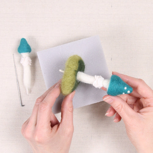 A nod to friendship and growth -this pair of mushrooms are inseparable! The Blue Roundhead needle felting kit includes all the supplies to make your own mushrooms: felting needle, foam cushion, roving, cotton stems, felt accents, dowel and a wood turned bowl. You will need scissors or wire cutters. Glue is optional. Instruction sheet includes step by step instructions and photos. For the enthusiastic beginner.