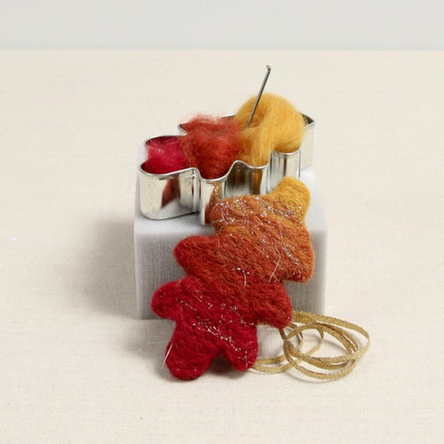 Includes everything you need to get started felting: Felting foam, felting needle, cookie cutter, wool roving, Angelina fibers and ribbon.