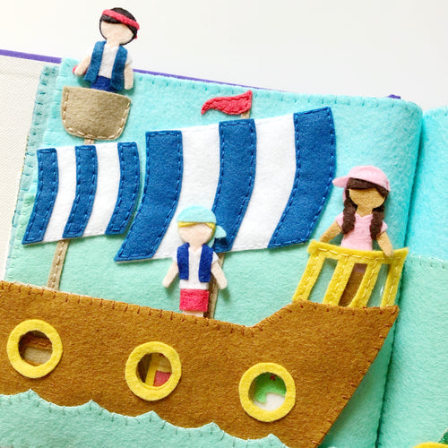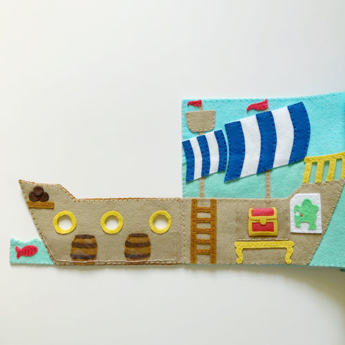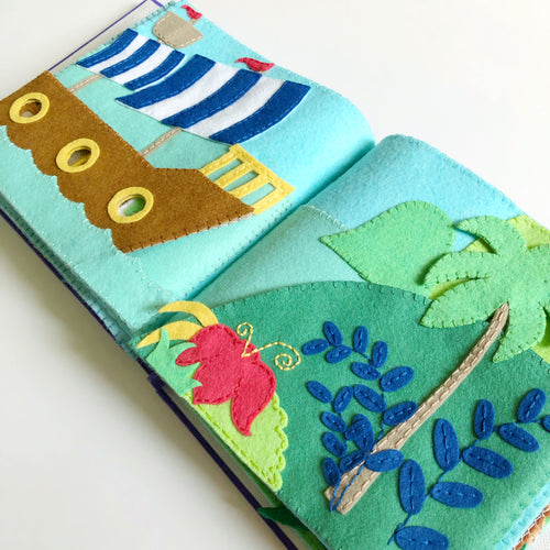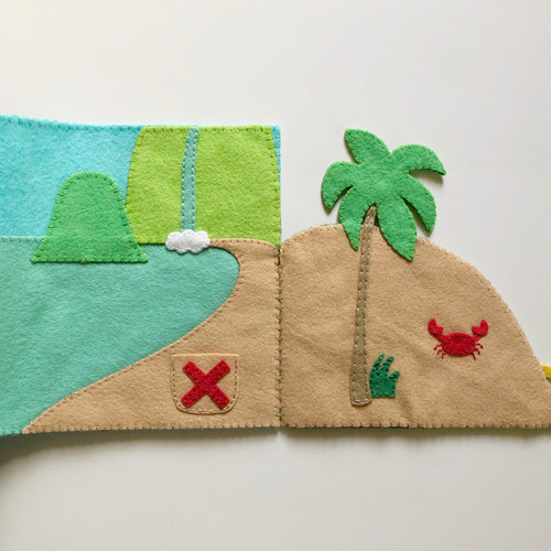 Ahoy, mateys! Your little buccaneer will enjoy hours of imaginative play with the Pirate Island Quiet Book by Blueberry Patterns via an instant downloadable pdf! Pirate Island features a ship scene complete with a crow's nest, treasure map, and storage pocket for your pirate figurines. A tropical island with lush jungle plants lies across the waves--open the flap to reveal a secret cove where X marks the spot!