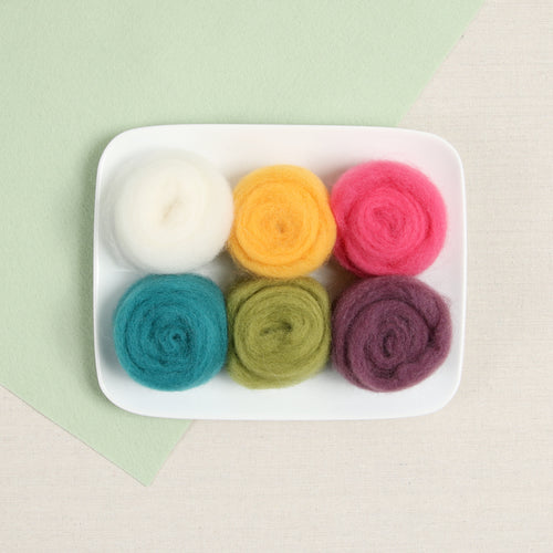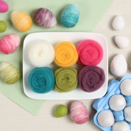 Prism, a roving collection in a spectrum of colors: White, Golden, Blossom, Peacock, Fern and Vineyard. Select six 1/2 ounce or 1 ounce balls of sliver roving for use in needle felting (we decorated felt eggs!), wet felting, or weaving.