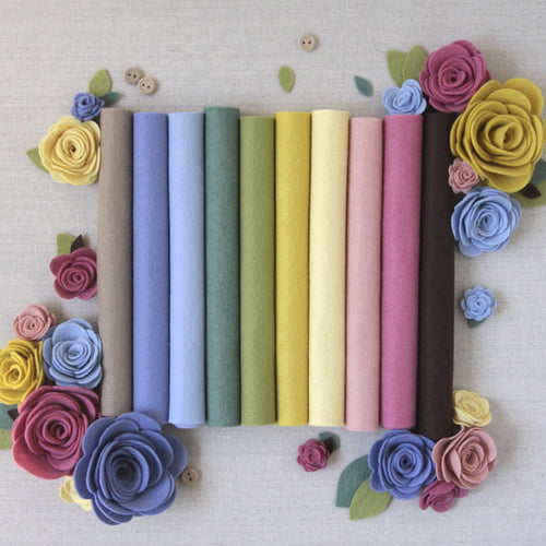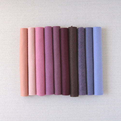 Benzie's wool blend felt in Rose, a medium pink. Select cut sheets or yardage-multiples of 1/2 yard cuts will yield one uncut sheet. Our bolts are approximately 36" wide. Full bolts are 40% off the retail price of cut sheets. Inventory on full bolts is limited, please contact us for availability.