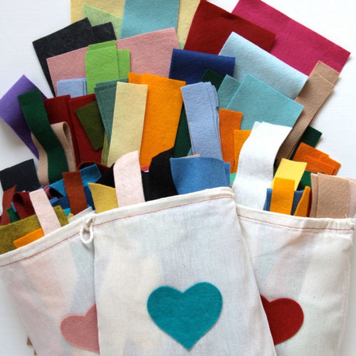An entire 8oz bag of Benzie felt remnants in a variety of colors and sizes -priced at almost 40% off! Our scrap felt comes from bolt ends, felt-fetti happiness, and surprises from our personal crafting adventures. These photos are an example of our scrap bags -each bundle is different and a great way to use Benzie's merino wool blend felt at a fabulous discount!