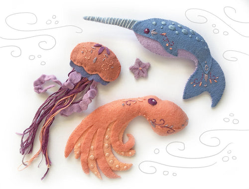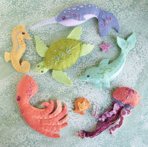 You will receive instructions, templates and patterns to make the creatures pictured, Octopus, Narwhal, Jellyfish, Dolphin, Sea Horse, Sea Turtle plus a tiny starfish and seashell. Just print the pattern, then cut and stitch the felt pieces by hand. Each animal is around 6 inches long.