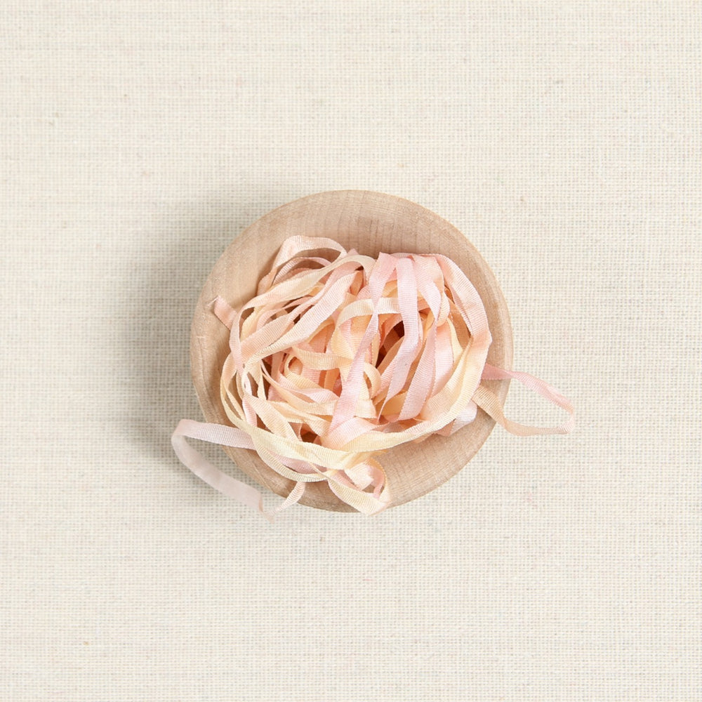 Hand-dyed ribbon with butter yellows and pastel pinks -so pretty! We love using 100% Silk Ribbon in embroidery, specialty stitches for needlepoint, crazy quilting, ruched stitches, and other embellishments.