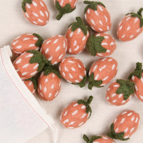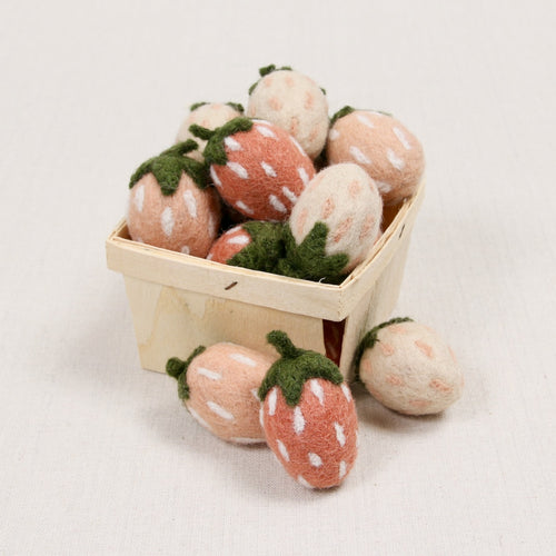 Mojave strawberries are sweet enough to eat! Each handmade berry measures 2 1/2" tall (minus stem) and 1 1/2" wide. These make great garlands, gift toppers or even play food! Includes 12 strawberries.