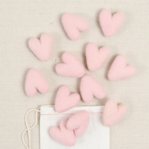 Sweet hand felted hearts are approximately 1 5/8" wide by 1 1/2" tall. Includes 12 hearts of one color.