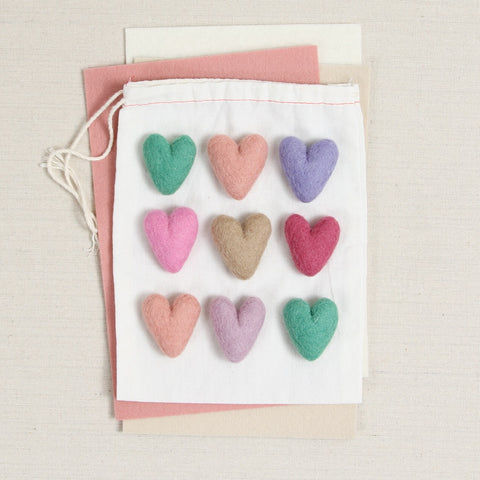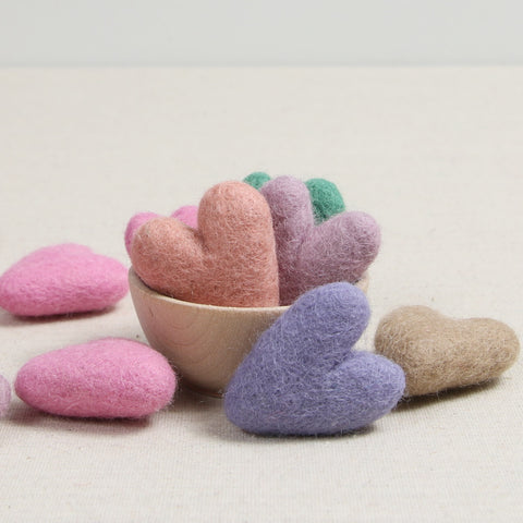 Sweet hand felted hearts are approximately 1 5/8" wide by 1 1/2" tall. Includes 14 hearts in the colors Castle, Geranium, Taffy, Mulberry, Blush, Allium and Violet.