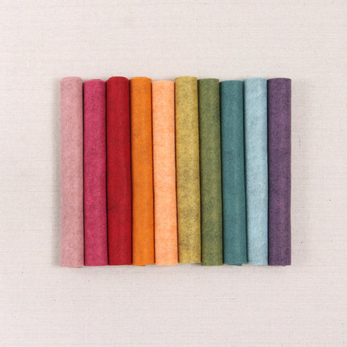 Benzie's wool blend felt in Turquoise, jewel toned and slightly heathered. Select cut sheets or yardage-multiples of 1/2 yard cuts will yield one uncut sheet. Our bolts are approximately 36" wide. Full bolts are 40% off the retail price of cut sheets. Inventory on full bolts is limited, please contact us for availability.