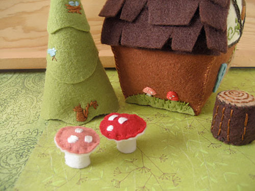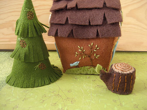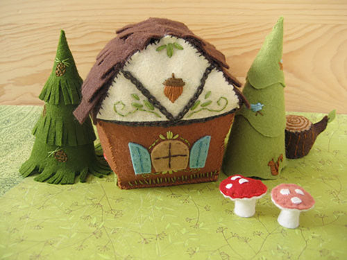 Here is a fun plush sewing pattern you can use to create your very own Woodland storybook cottage! Included are templates, embroidery patterns and instructions to make one 5 inch tall cottage, trees, decorations, everything you see here. You can use the patterns to decorate your house any way you wish. Just print the pattern, then cut and stitch the felt pieces by hand. Read about how Little Dear transfers embroidery pattern on our blog!