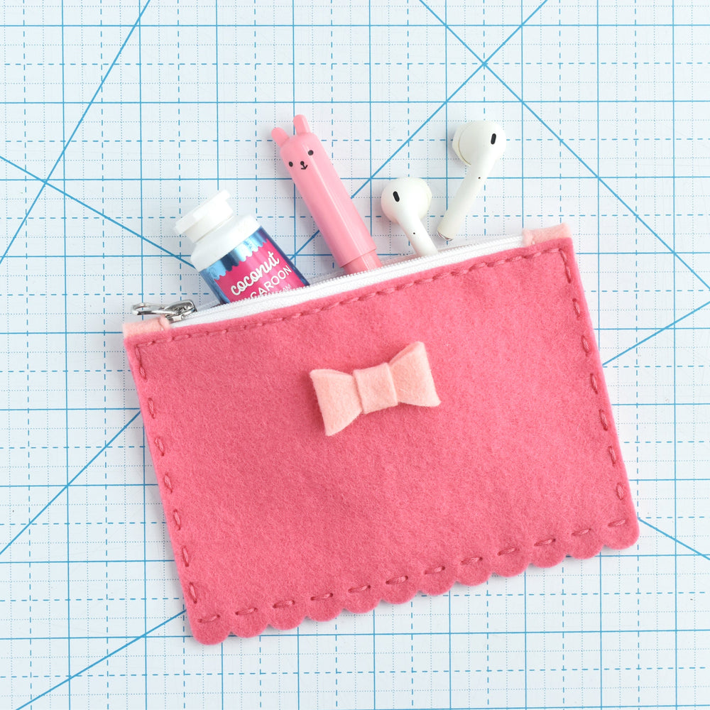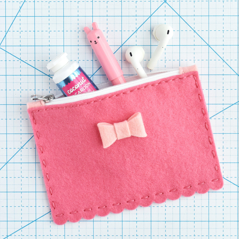 This might be the easiest zipper pouch you'll ever make! Stitch marks allow you to hand-sew the entire project out of felt, and the set includes three sizes (two with round corners and one with a scalloped edge), zipper ends, and a bow that features a piece doubling as a key clip tab. See our tutorial for how to assemble the pouches.