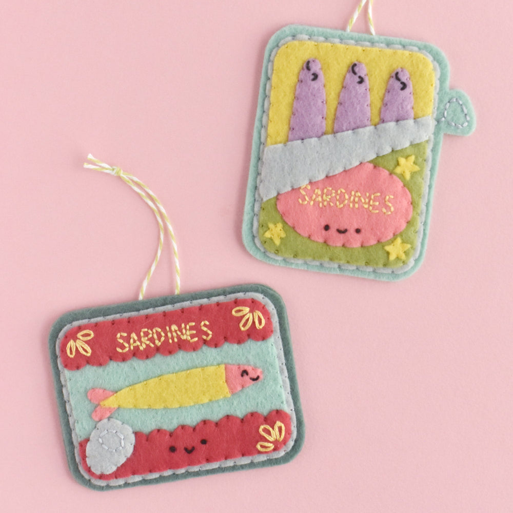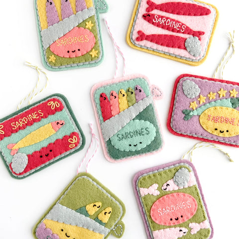 Sardine cans have never been so cute! Stitch up these felt ornaments to adorn your tree or simply as a fun way to show off your love of sardines.