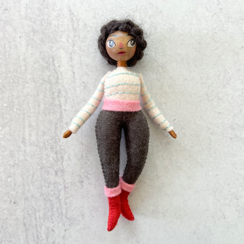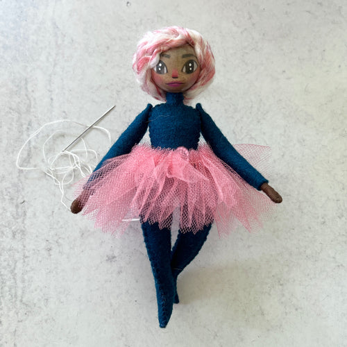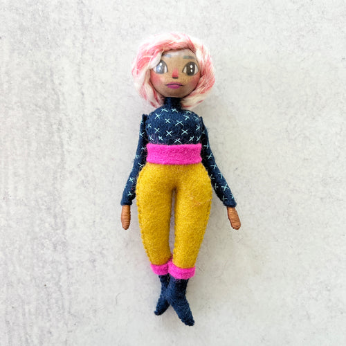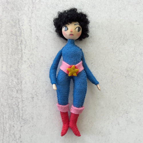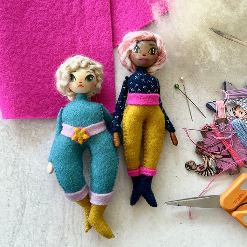 This PDF pattern download will give you instructions and patterns to make all three dolls. Each doll follows the same basic instructions but there are different outfit patterns, body shaping techniques and additional instructions for making your doll “Super Special.” There are also detailed guides for creating the face and hair for unique SuperBods. Finished dolls are 5 ½ to 5 ¾“.
