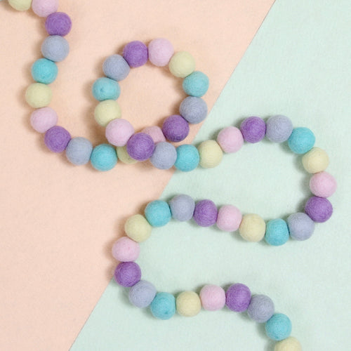 Unicorn dreams and fairy wings -everything this garland is made of! The soft colors include Butter, Thistle, Sky, Peony, and Aqua. Coordinates with our Pastel rainbow and Pixie Dust Felt Palette! Total 50 poms.