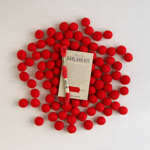 The coordinating Add-on Kit includes one skein of our favorite pearl cotton stringing thread, a needle that is just the right size for poms plus a baltic birch wood thread bobbin to keep your pearl cotton tidy. Instructions included on how to unwind the skein and make a garland. Add-on kit does not include poms.